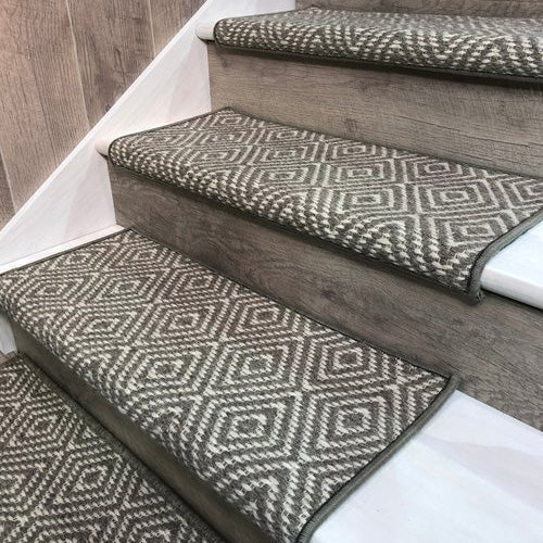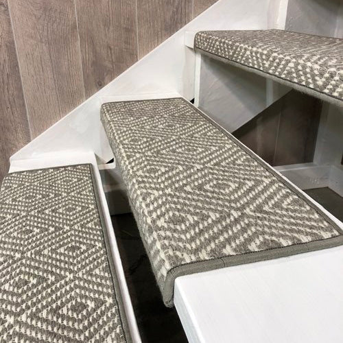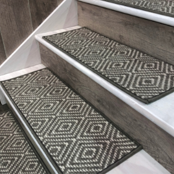 Square edge stair treads have a 90 degree edge at the front of the stair. Our square treads are crafted with proprietary adhesive and shaped to perfectly fit the square edge on the front of the step.